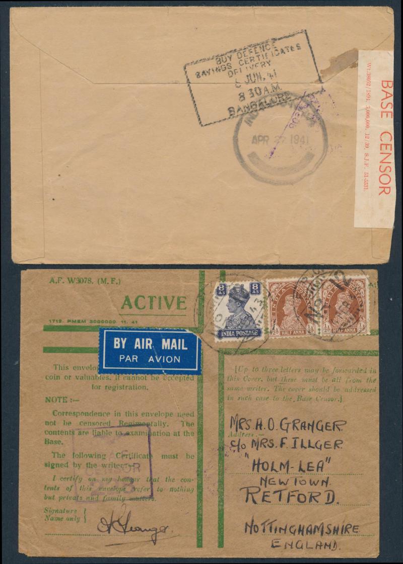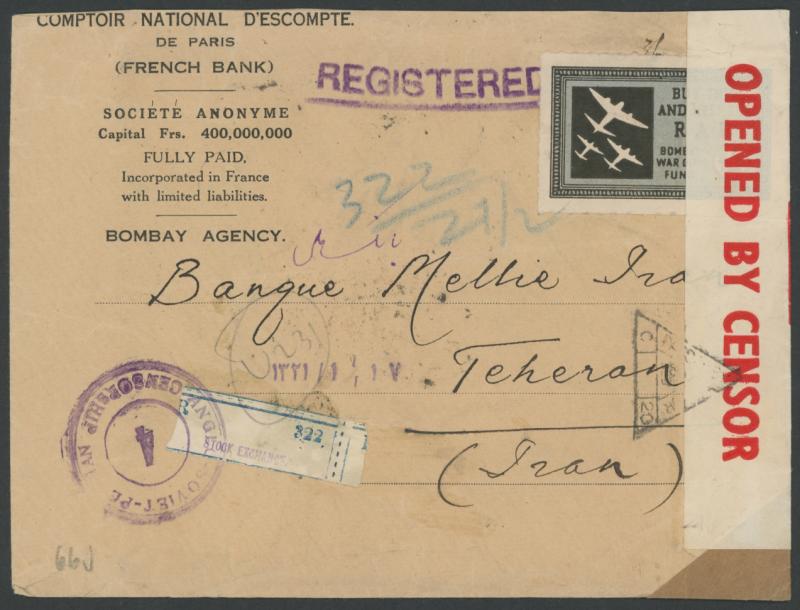 pair affixed on reverse tied by 'STOCK EXCHANGE/BOMBAY' cds cancels with matching blue/white R label on the face, 'BUY THIS/AND HELP THE/R.A.F./BOMBAY/WAR GIFTS/FUND' illustrated black & blue/white patriotic label affixed on the face tied by censor