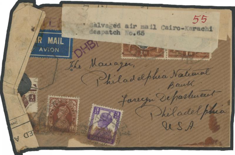 label on the reverse, badly damaged in the crash of BOAC 'Hudson' at Khartoum on 16.6.1943 & returned with 'DLO/BOMBAY/25AUG42' backstamp, repaired with re-sealing labels & roneo'd 'Salvaged air mail Cairo-Karachi/despatch No 65' label affixed (at