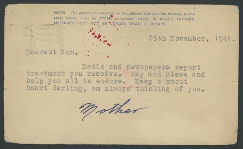1944 (Nov 28) British 3d violet POW Airmail Postal Card to No 2 Camp at Chungkai Thailand but received after Japan had surrendered