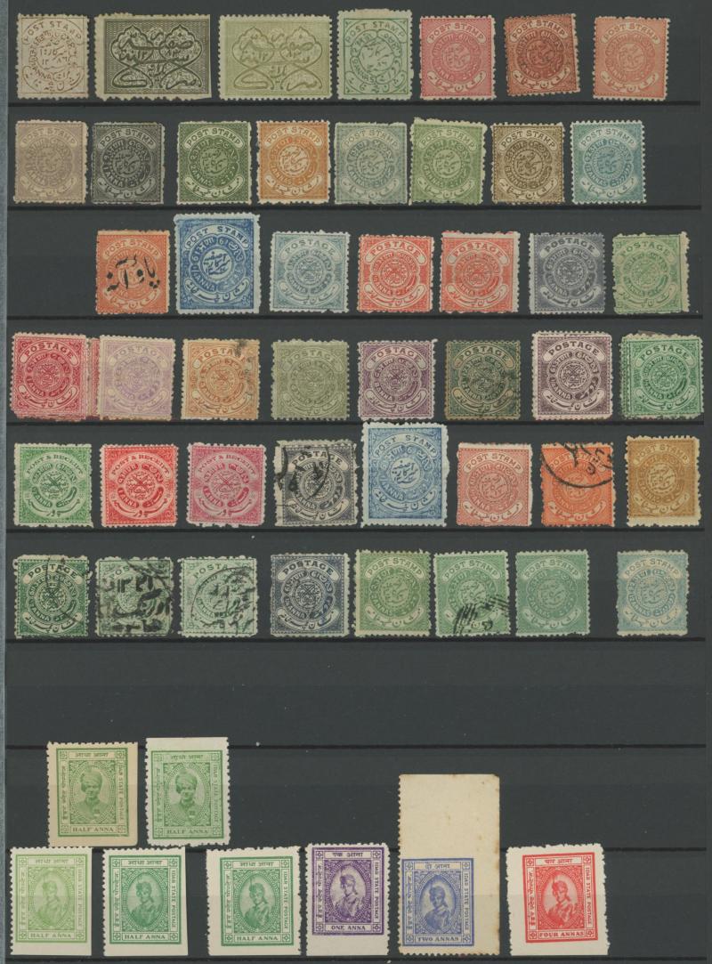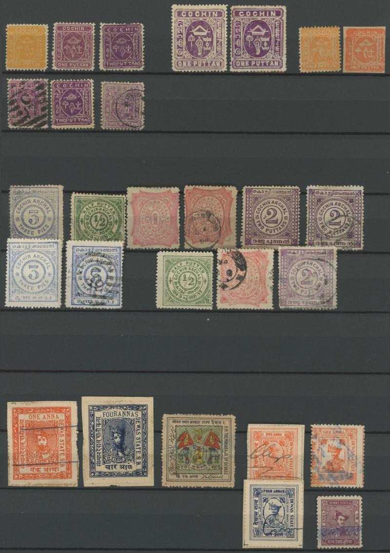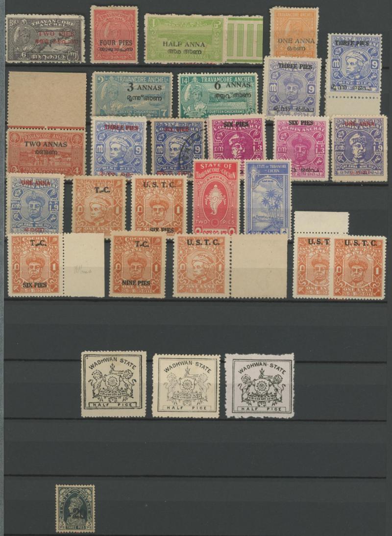 1868-75 1a black/pink all used plus 1868-75 Devanagari Numeral 4a black/white unused, Travancore-Cochin 1949 overprints range including '3 ANNAS' & '6 ANNAS' on Pictorials, Wadhwan 1888-94 ½pice on Thin, Medium & Thick Papers, plus many, many more,