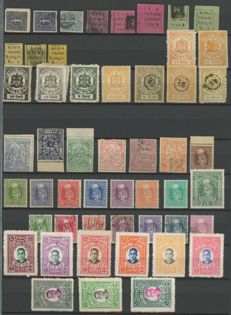 black/white and on other colours unused x2 & used x2 plus 1901 1a black/orange, Nawanagar 1877 Sword Perf 11 1doc blue (a few short/missing perfs), Orchha 1939-42 Maharaja Vir Singh II range including 1r green plus low values with apparently fake