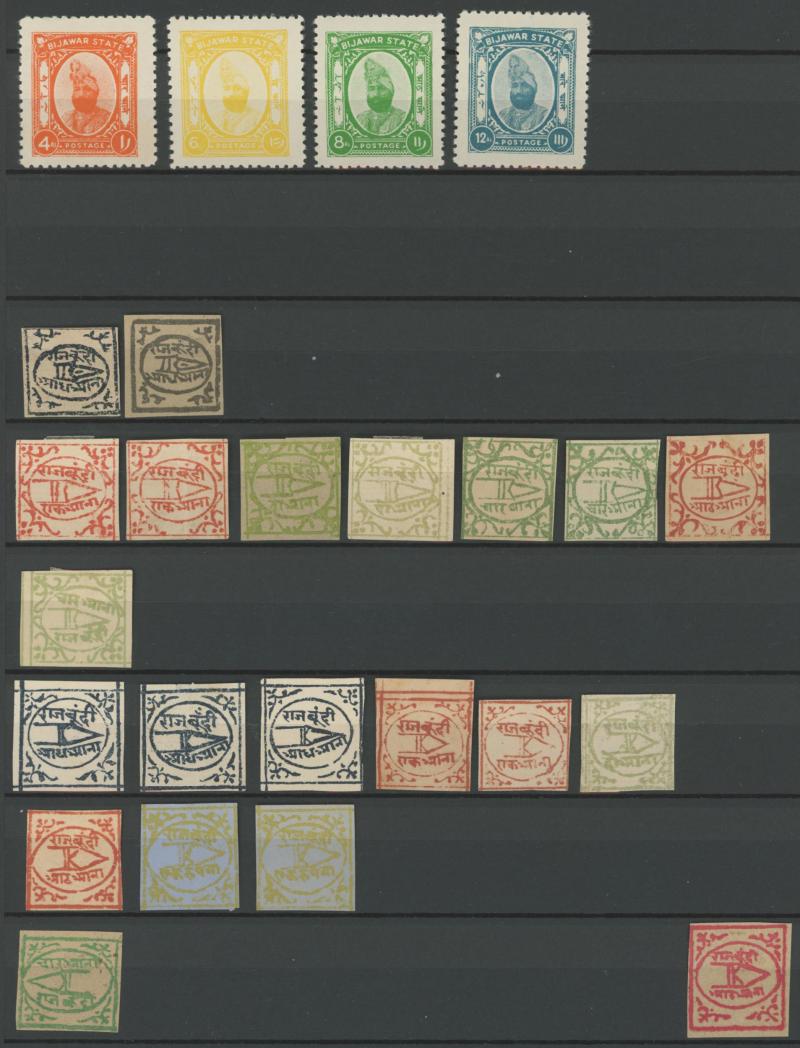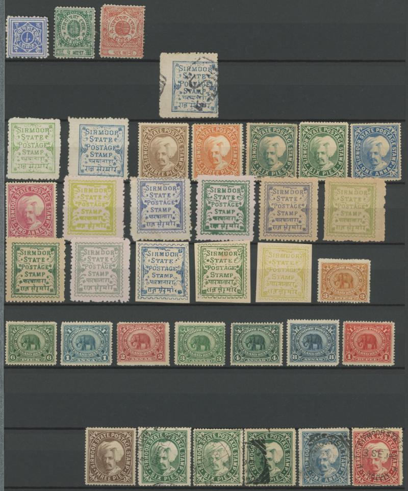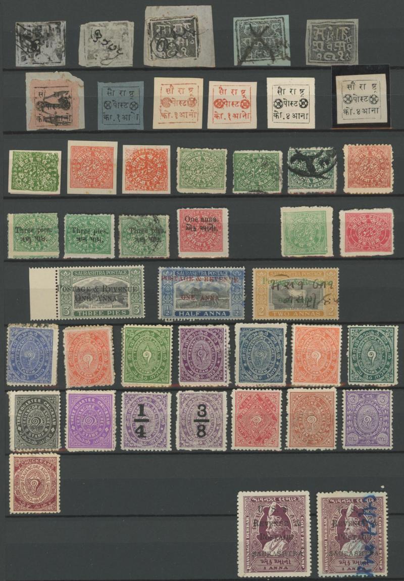 cancels (not counted), Rajasthan Handstamped in Blue on Bundi 1r, Rajpipla 1880 4a red used, Sirmoor 1878-80 1p blue on Horizontally Laid Paper with neat 'S'-in-bars cancel & 1894-99 Elephants set, Soruth 1864 1a black/azure, 1a black/grey x3 and