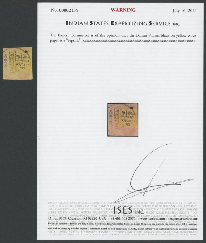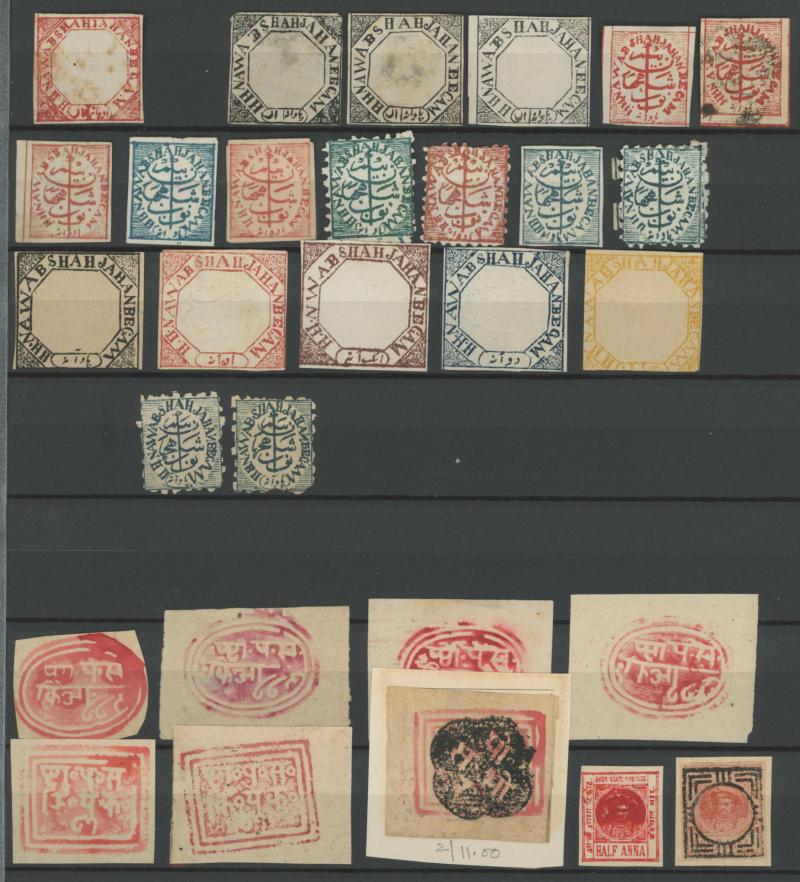 certificate) & 4a unused x2 plus a small group of 1890-93 issues, Barwani 1917-21 Clear Impression ¼a blue-green (perf fault at upper-left) & 1931 4a salmon, Bhopal 1884 Type 13 ¼a blue-green (a few short perfs), Bhor 1901 ½a red used, Bijawar 1937