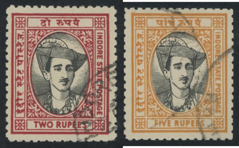 INDORE: 1943 Maharaja Yeshwant Raw Holkar II 2r black & carmine and 5r black & yellow-orange SG 42 & 43, well-centred with