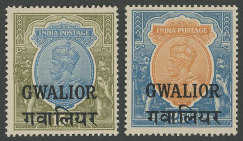 GWALIOR: 1928-36 Overprints on KGV Definitives Multiple Stars Watermark 1r chocolate & green, 2r carmine & orange with the