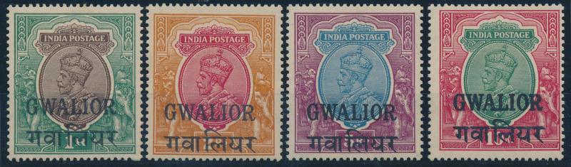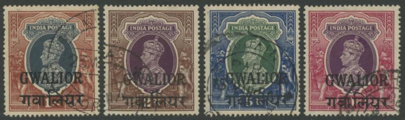 SG O91-O94, centring variable, all with Gwalior cds cancels, the 10r with a hinge thin otherwise fine to very fine, Cat £3300+. Not expertised, and so necessarily offered 'as is'. (Image1) (Image2)