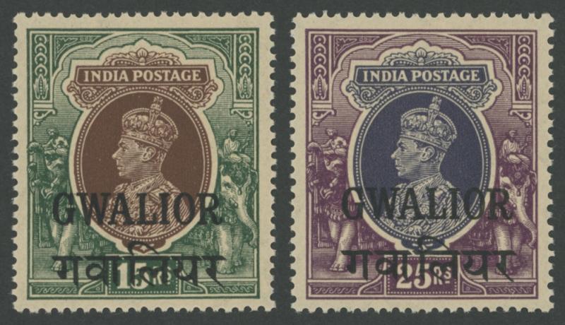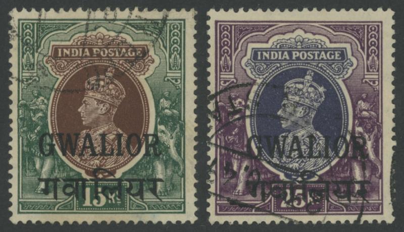 GWALIOR: 1938-48 Overprints on KGVI Heads 1r grey & red-brown, 2r purple & brown, 5r green & blue, 10r purple & claret, 15r brown &