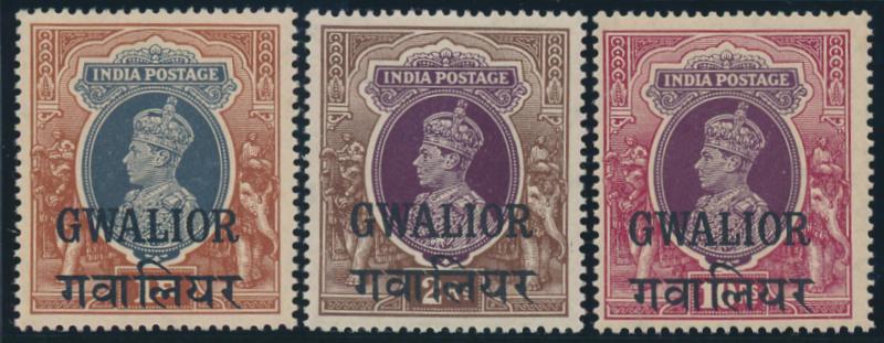 GWALIOR: 1938-48 Overprints on KGVI Definitives Multiple Stars Watermark 1r grey & red-brown, 2r purple & brown, 10r purple &