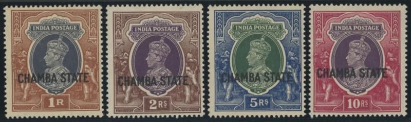 CHAMBA: 1938 'CHAMBA STATE' Overprints on KGVI Definitives Multiple Stars Watermark 1r grey & red-brown, 2r purple & brown, 5r