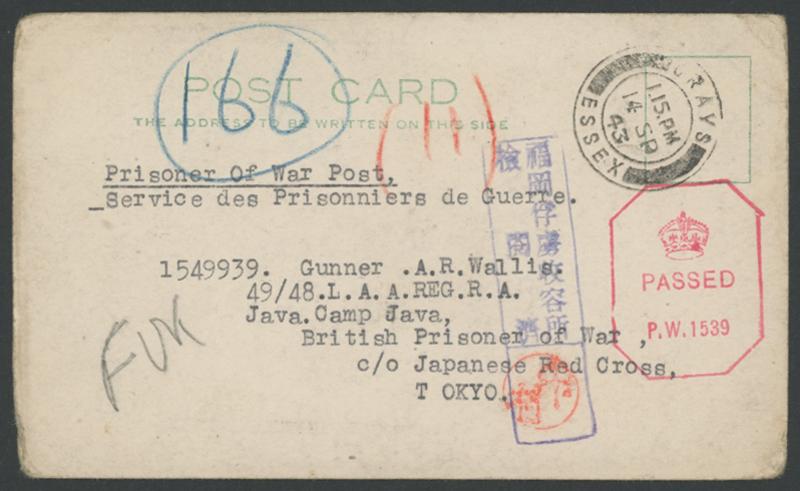 1943 (Sep 14) Fukuoka (Number 11) Prisoner of War Camp, Kyushu plain postcard from Essex to "Java Camp" with British censor, in