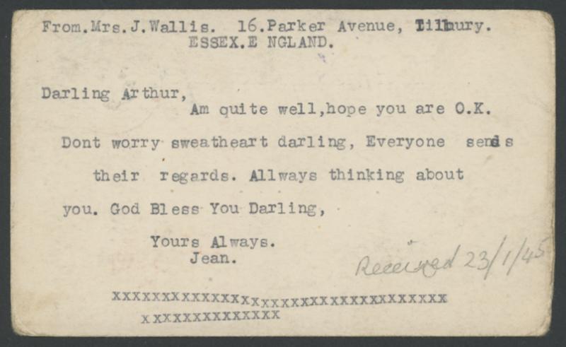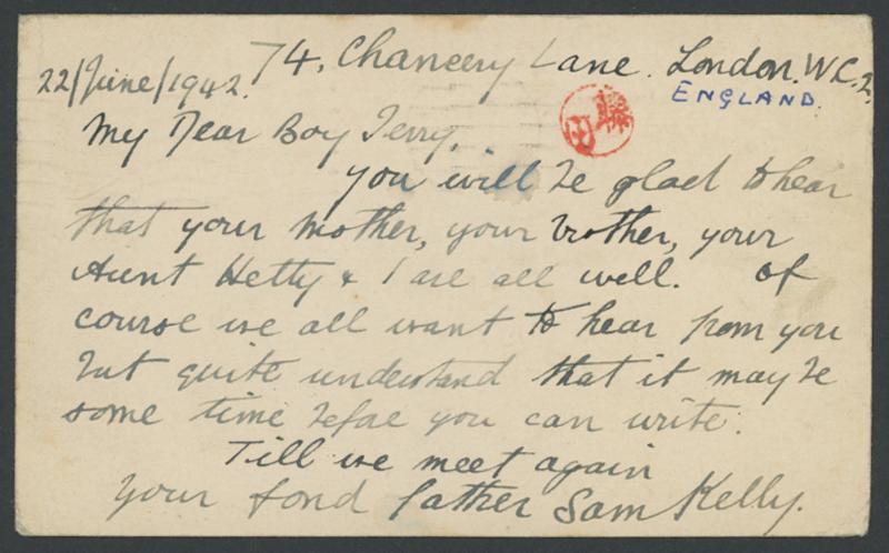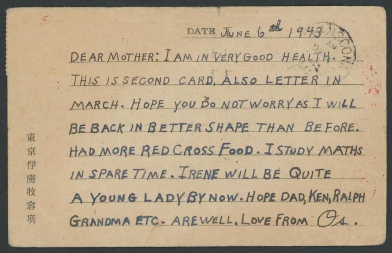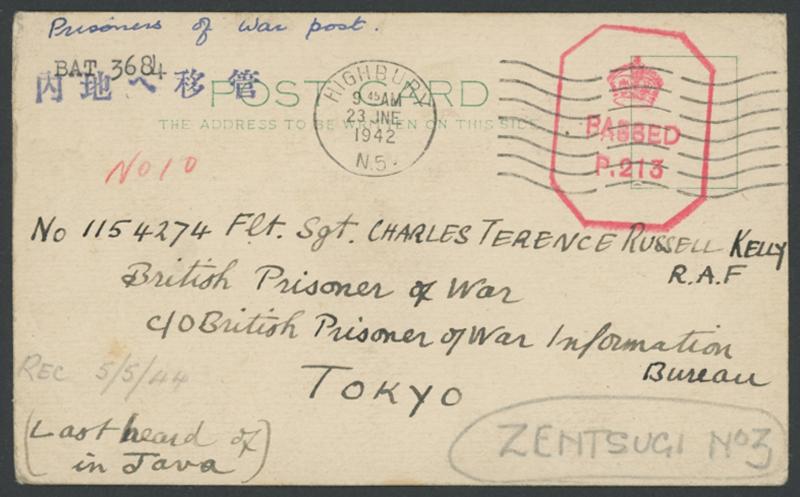 1942 (June 23) Zentsuji Prisoner of War Camp, Shikoku plain postcard to Tokyo endorsed "Last heard of/in Java", from London with