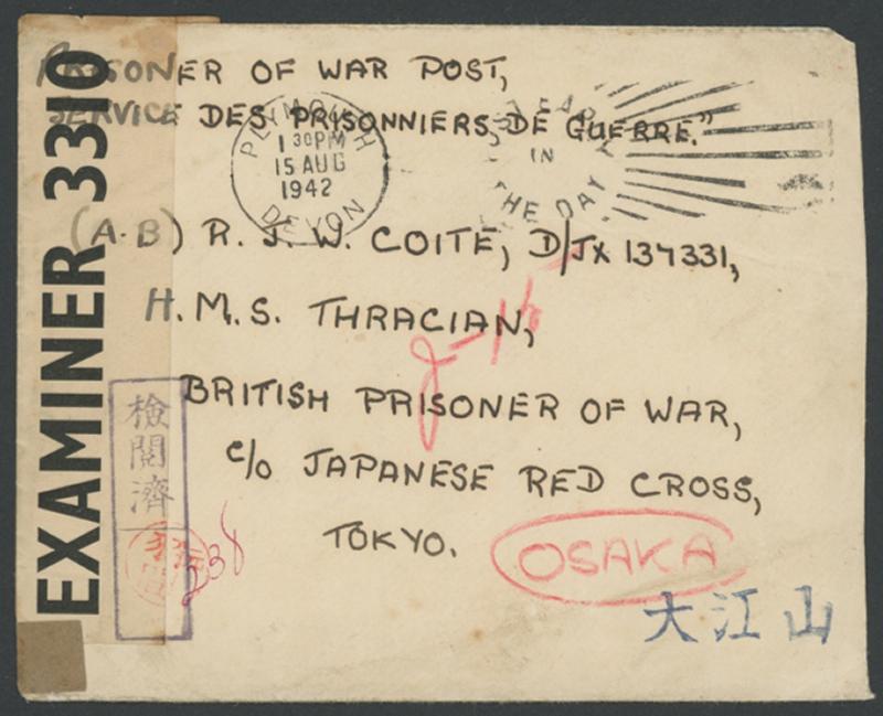 1942 (Aug 15) Osaka (Oeyama) Prisoner of War Camp, Honshu cover from Devon with British censor label, to "HMS Thracian/ .../Tokyo"