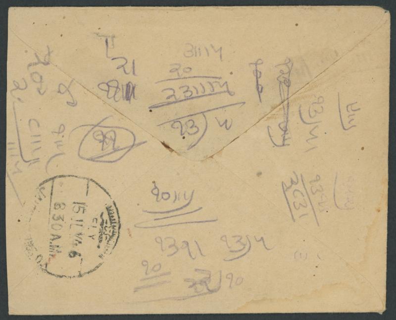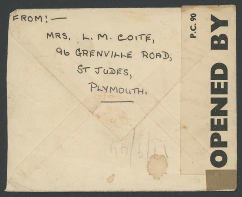 British censor in rosine, Japanese cachet in blue & han in scarlet on the reverse (neither recorded by David Tett), pencilled "Zentsugi No 3" & "Rec'd 5.5.44", minor blemishes. (Image1) (Image2)