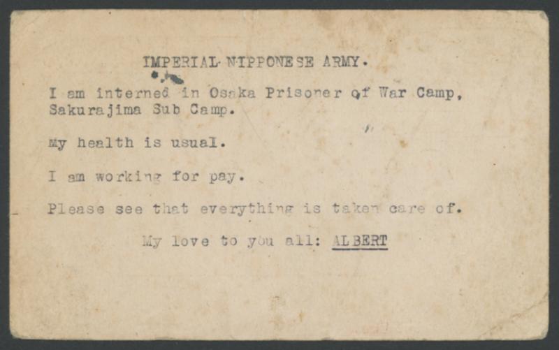 1942 Osaka (Sakurajima) Prisoner of War Camp, Honshu undated Japanese red & black/cream POW postal card with typed pro forma