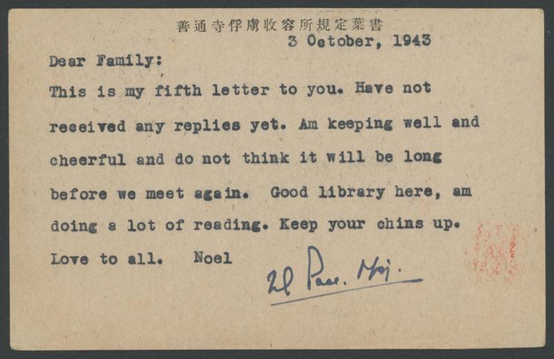 upper-left & characters at top of the reverse, to GB with large Zentsuji Camp cachet in violet & han of Hosotani in scarlet, Japanese-language cds & British censor in rosine. Writer states "This is my fifth letter to you. Have not received any