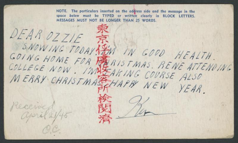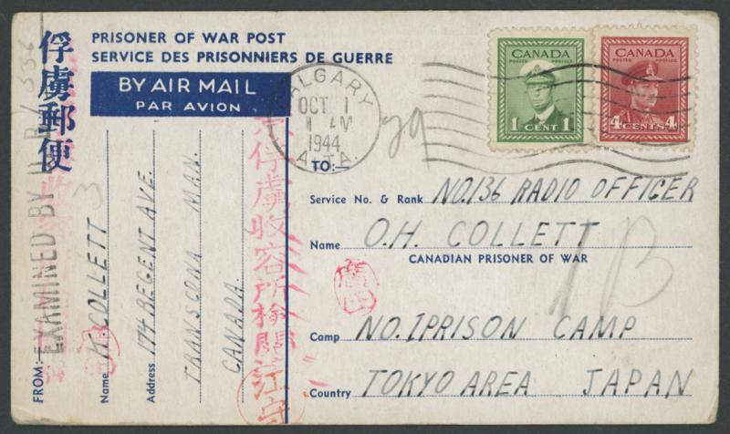 1944 (Oct 1) Canadian POW airmail postal card with Uniforms 1c & 4c tied by Calgary machine, to the sender of the previous item with Japanese censor and oval han of Hirota in rosine & circular han of Emori in scarlet, endorsed on reverse "Received/