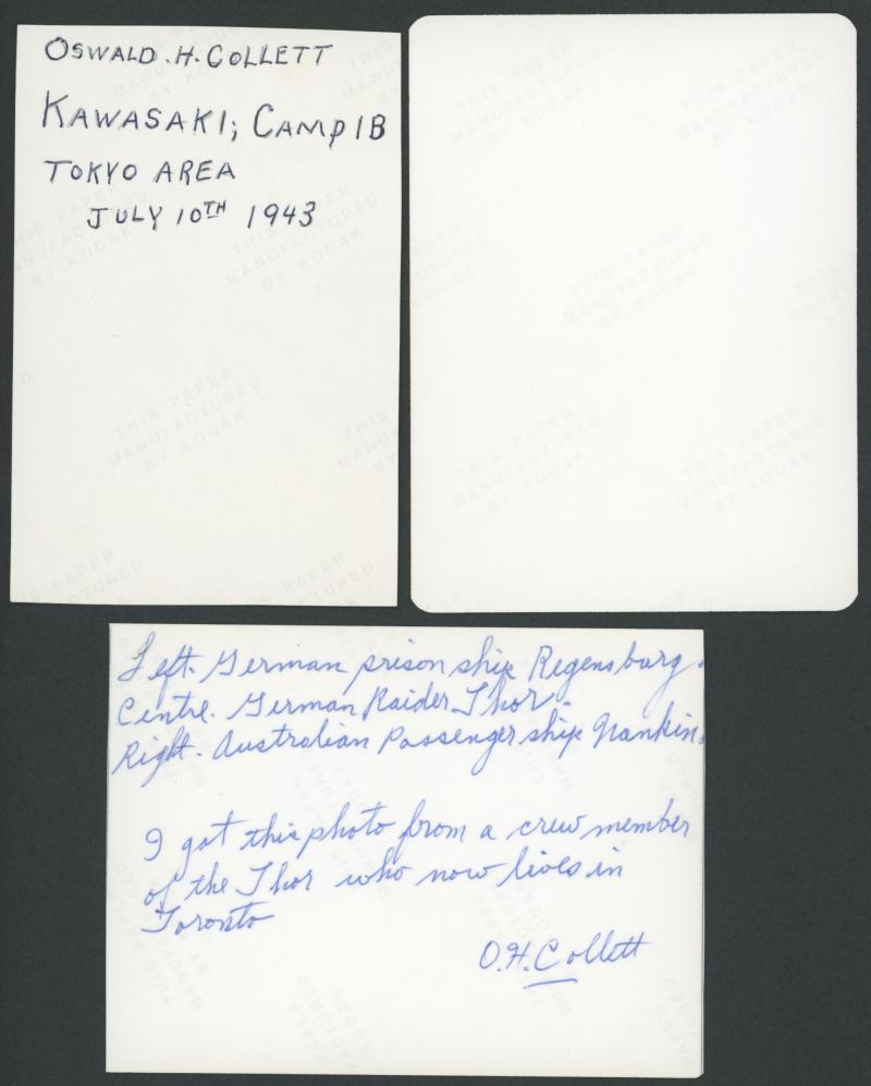 April 21 45". An attractive duo. On 3.4.1942, Oswald Collett was captured by a German ship in the South Atlantic and taken to Japan, arriving 25.8.1942. With three non-contemporary photo prints.
