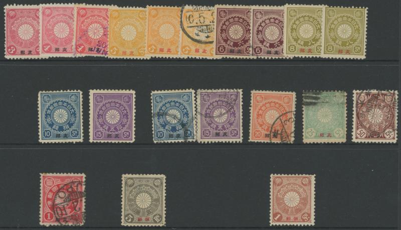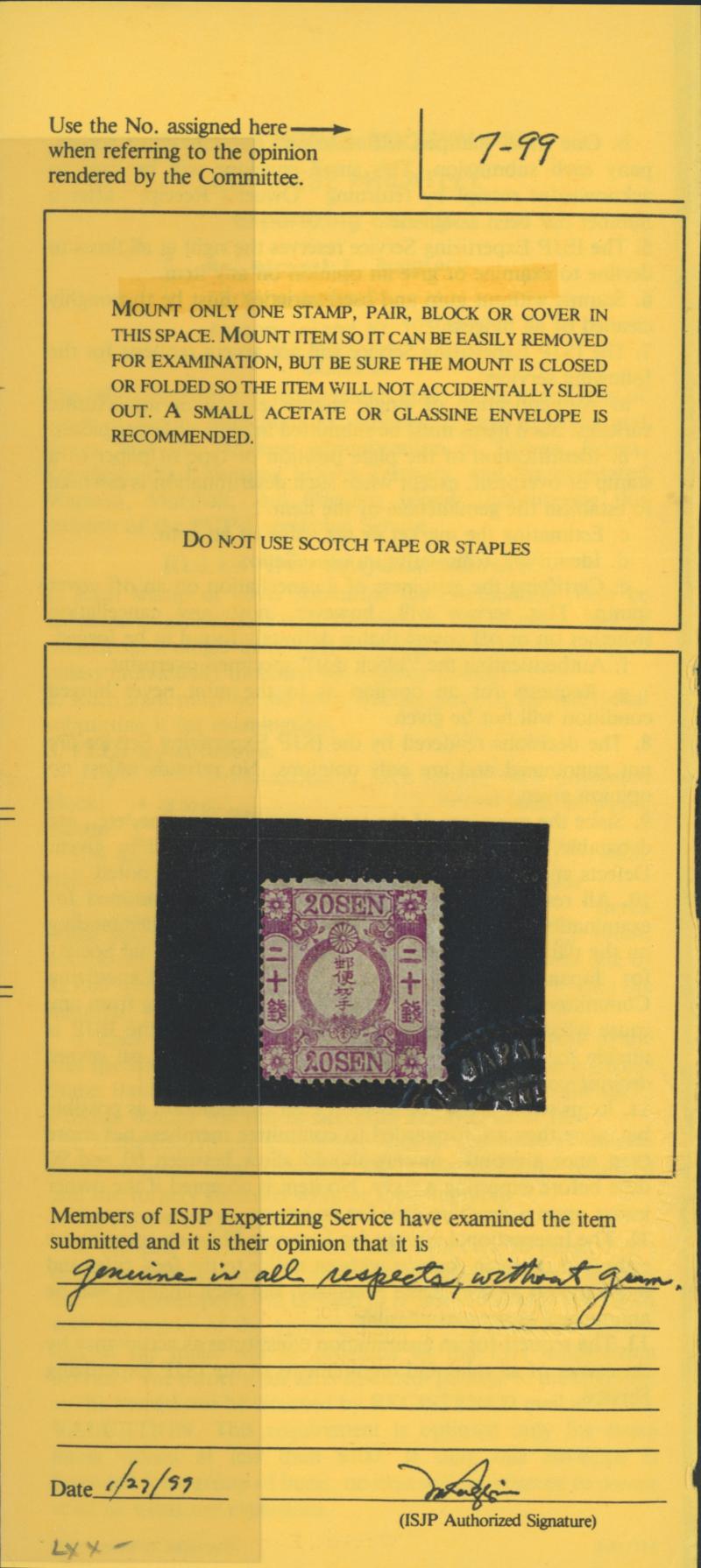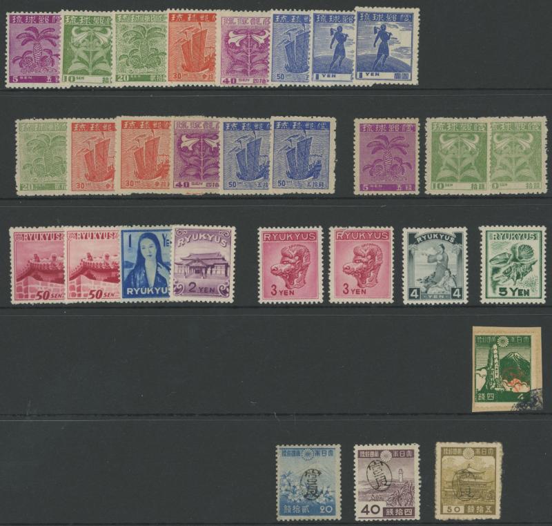 30s including 10s yellow-green, 20s lilac (unused; ISJP Certificate) and 20s aniline violet, etc; Japanese Post Offices in China mint/unused to 15s and used to 1y; and half a page of Ryukyus including 1950-58 set **. Only the one stamp expertised so
