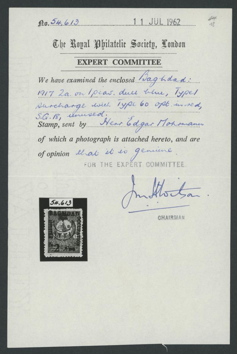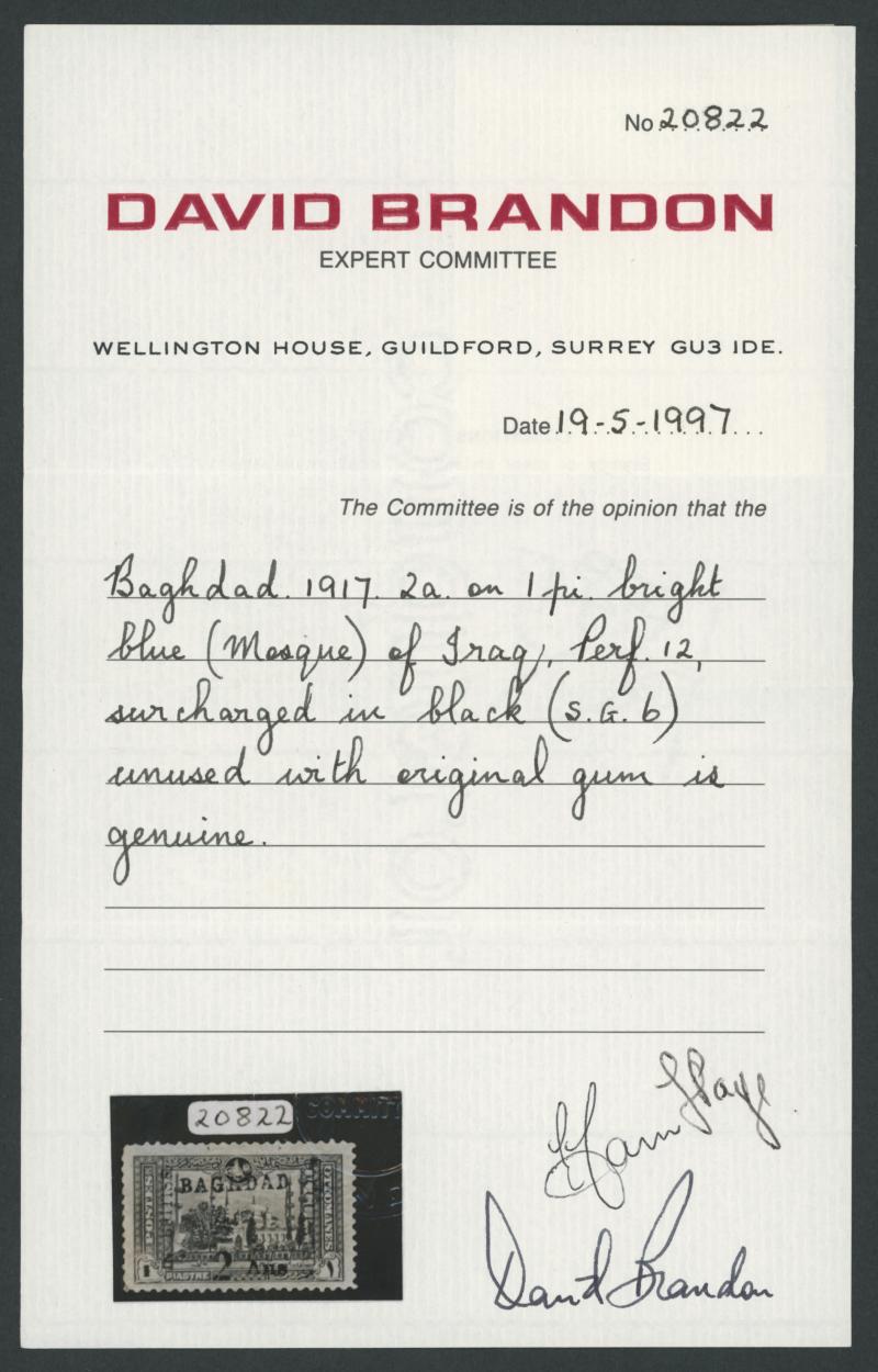 1917 Baghdad under British Occupation Six-Pointed Star & Crescent in Red on '2 Ans' on 1pi dull blue SG 18, very lightly mounted,