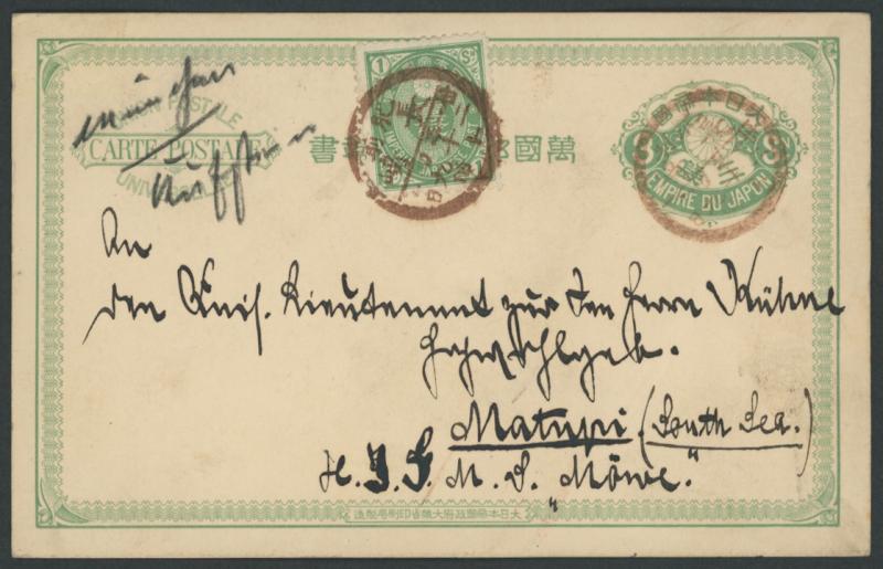 on the reverse and added franking of Koban 1s green tied by Japanese-characters cds, to an officer on board the German survey ship (converted gunboat) SMS 'Möve' [Seagull] at Matupi, German New Guinea with lengthy hand-written message, a couple of