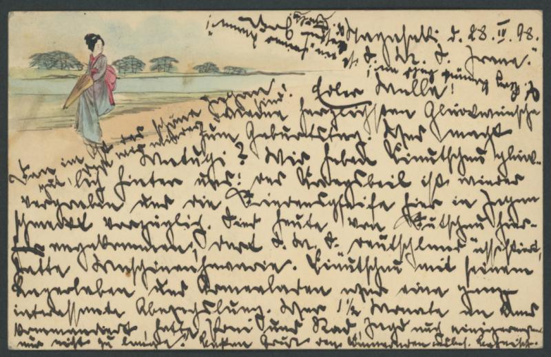 1898 (Aug 28) usage of Japan Postal Card 3s green with hand-coloured (hand-painted?) illustration of a lady walking along a river