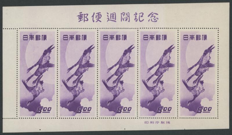 1948 Postal Week 5y 'Moon and Bent Geese' Painting SG 556 complete sheetlet of 5 with inscription at top & imprint at base, lightly