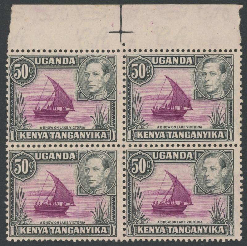 1938-54 KGVI Pictorials 50c with Rope not Joined to Sail SG 144a being the lower-left unit in a marginal block of 4 from the top of