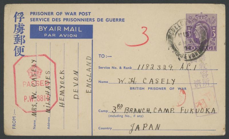 1944 (Aug 29) Fukuoka (Yawata Number 3) Prisoner of War Camp, Kyushu British 3d POW Airmail Postal Card from Devon to "3rd Branch