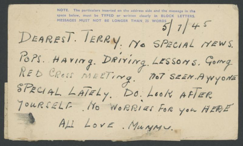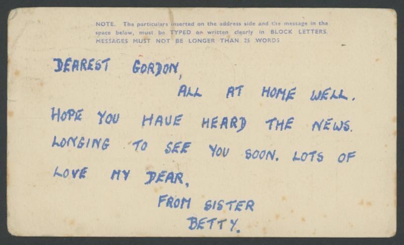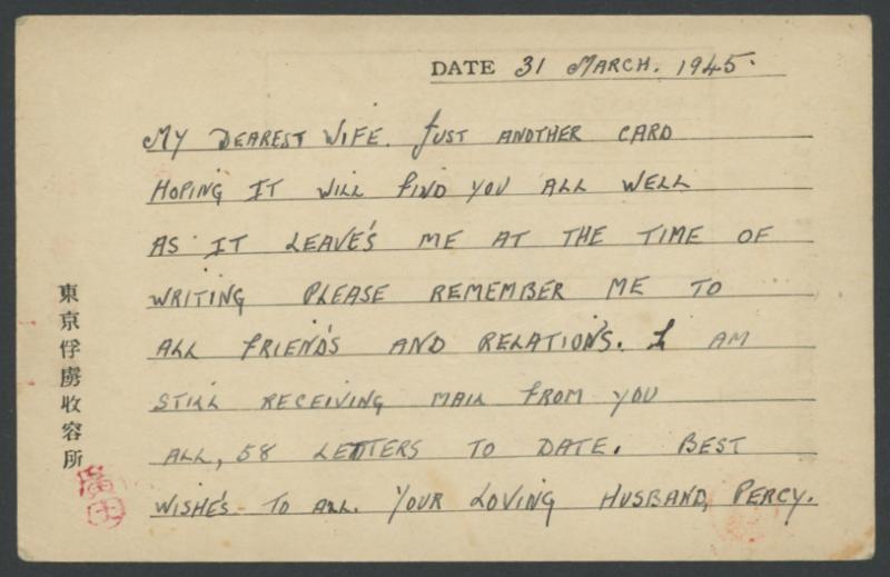 censor in rosine but no Japanese markings, bumped corners & minor spots. Apparently delivered, probably after Japan surrendered. The POW's sister states "Hope you have heard the news" but doesn't say what it is (presumably the imminent surrender of