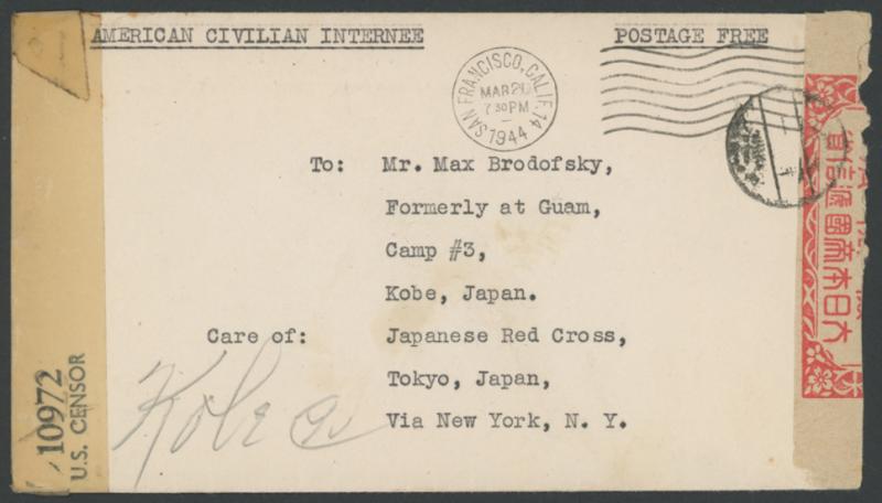 civilian "formerly at Guam/Camp No 3/Kobe", Japanese censor label & cds, pencilled "Kobe"; with the enclosed brief letter. The addressee, Max Brodofsky, had been the PanAm manager at Guam. Illustrated by David Tett in Volume 6 at page 98.