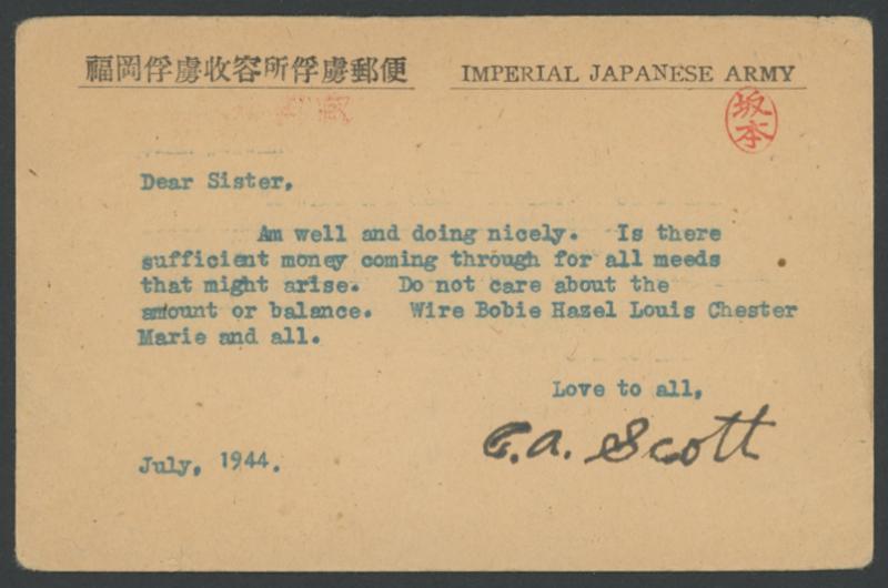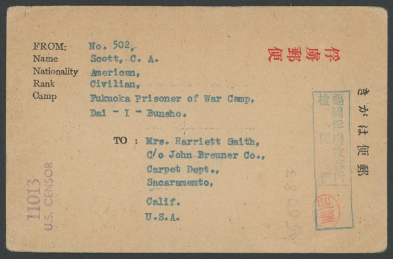 with light camp censor in violet, very fine han of Kitano in scarlet, on the reverse superb han of Sakamoto, minor defects. Prisoners were used by Takamatsu Coal Mining Co, where conditions were so bad that 74 POWs died. Two senior Japanese officers