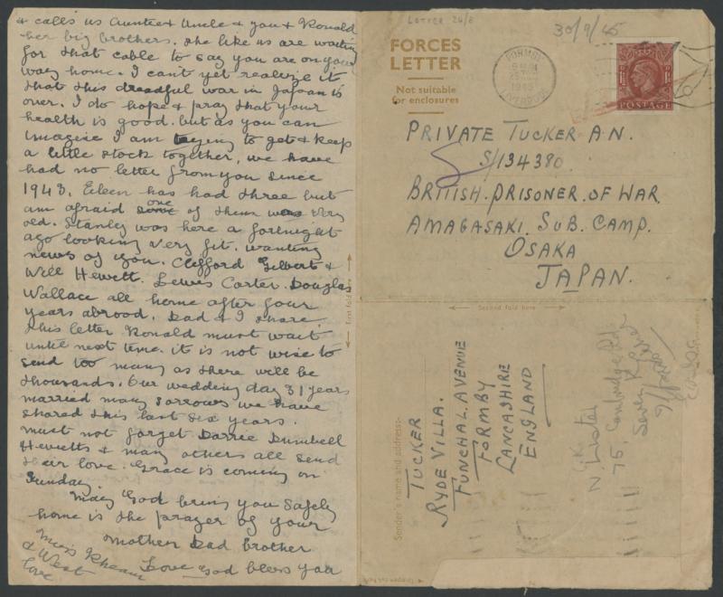 Sub-Camp/Osaka" with full letter, pencilled "30.9.45" receival on the face. Posted after Japan surrendered so it's surprising that it was delivered to Japan. David Tett mentions Amagasaki only twice, with no details: it must have been a very small