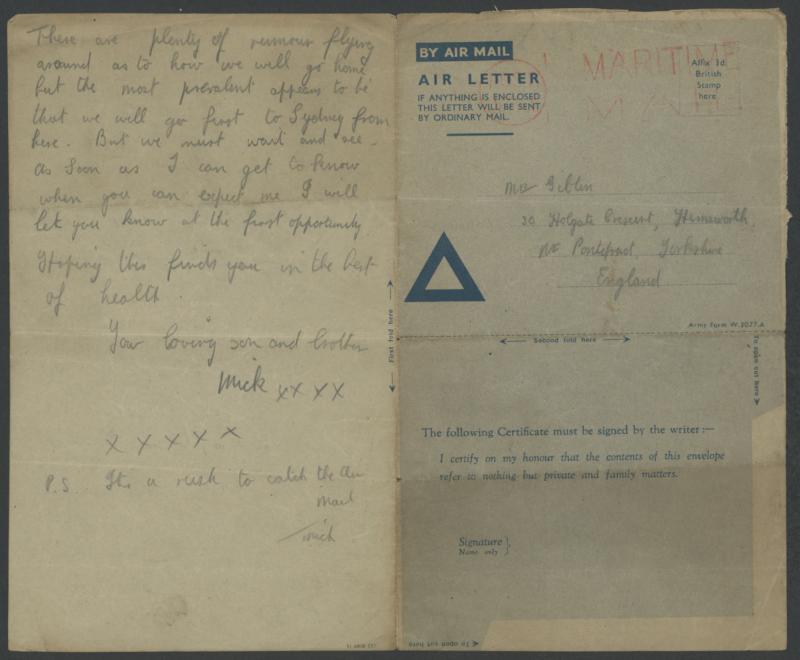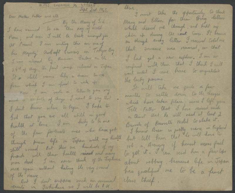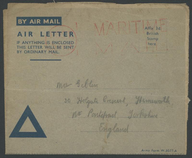 triangle' aerogramme with letter headed "HMS Speaker/Sept 2nd 1945", to Yorkshire, the only postal marking being British 'POST/OFFICE - MARITIME/MAIL' machine in red, a few folds. The writer, formerly held at Omori, states: "... I have survived to