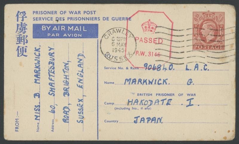 1945 (May 6) Hakodate Prisoner of War Camp, Hokkaido British 1½d red-brown POW Airmail Postal Card to "Hakodate I" with British