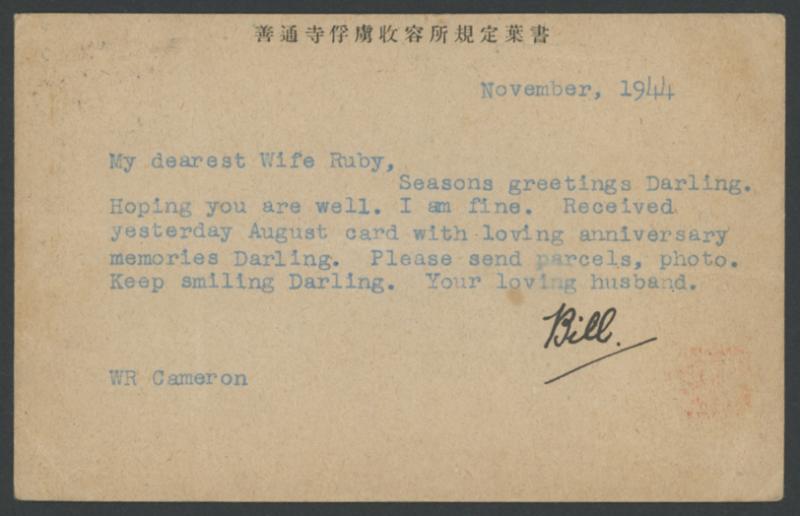 1944 (Nov) Zentsuji Prisoner of War Camp, Shikoku simple Japanese POW postal card with 'ZENTSUZI [sic] WAR PRISON CAMP/NIPPON' at