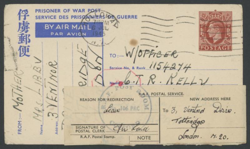 1945 (July 6) Zentsuji Prisoner of War Camp, Shikoku British 1½d red-brown POW Airmail Postal Card to Zentsuji with 'HOLLOWAY'