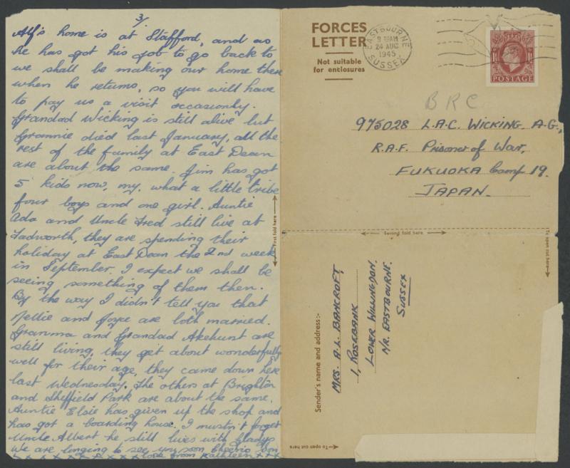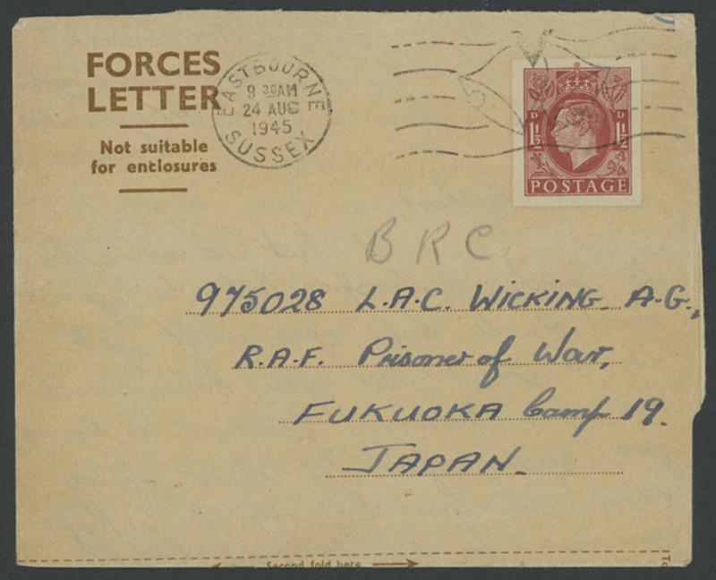 1945 (Aug 24) Fukuoka (Number 19) Prisoner of War Camp, Kyushu British 1½d red-brown POW Forces Letter to "Fukuoka Camp 19", posted