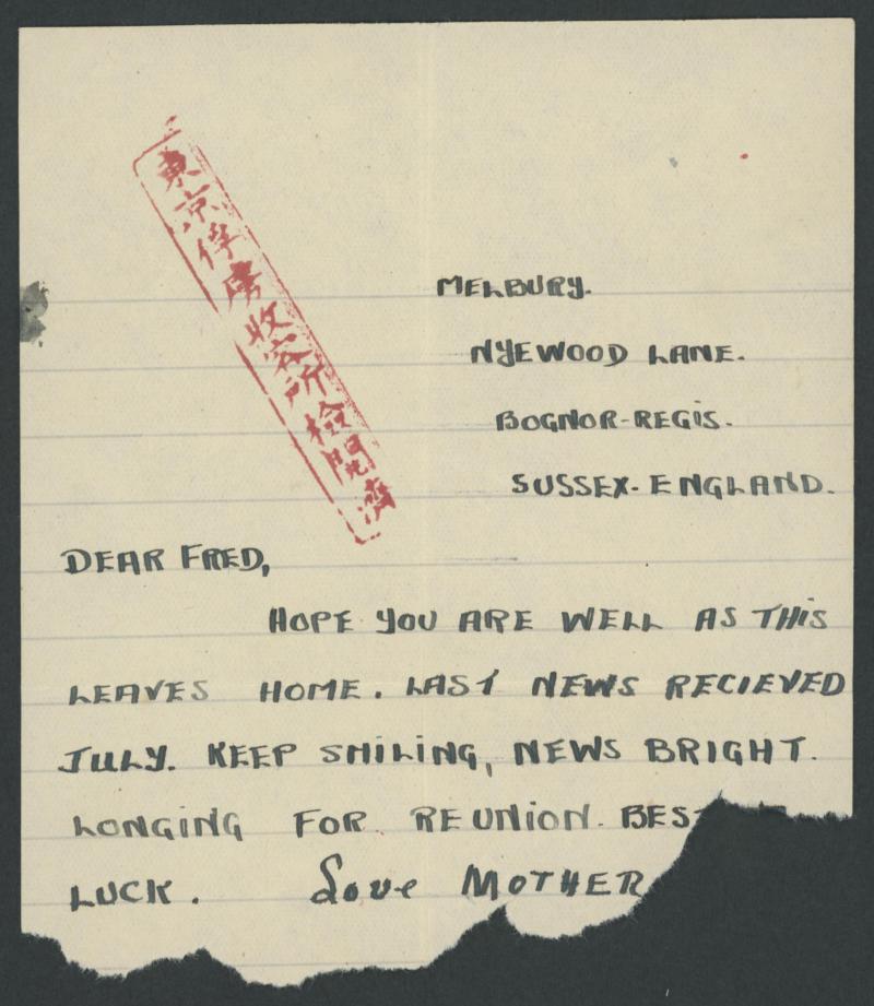 sides & on the enclosed letter which is roughly torn at the base (by the censor?) but unusually with no han, endorsed "HQ" in blue pencil. Driver Fred Boughey was captured in Hong Kong & spent time at Kowloon & Shinagawa Camps before transfer to
