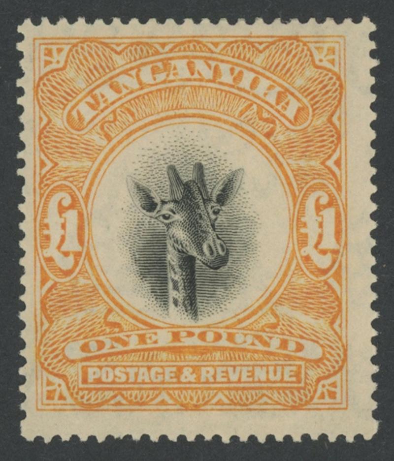 TANGANYIKA: 1922-24 Giraffes £1 black & yellow-orange with the Watermark Upright SG 88a, characteristic wayward centring, very