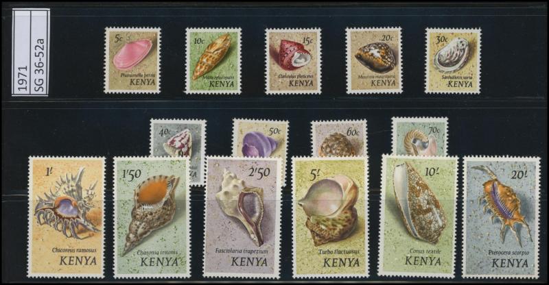 couple of tiny aging marks), 1938-54 KGVI Pictorials simplified set ** plus £1 block of 4 ** and a few perf variations */**, 1948 Silver Wedding £1 used, 1954-59 & 1960-62 QEII Pictorials sets **, plus Kenya 1971 Shells set, a few Officials * &