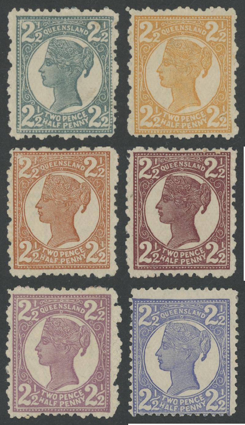 1897-1908 QV Sidefaces Numerals at Four Corners Crown/Q Watermark '6' 2½d perforated colour trial singles on gummed Crown/Q