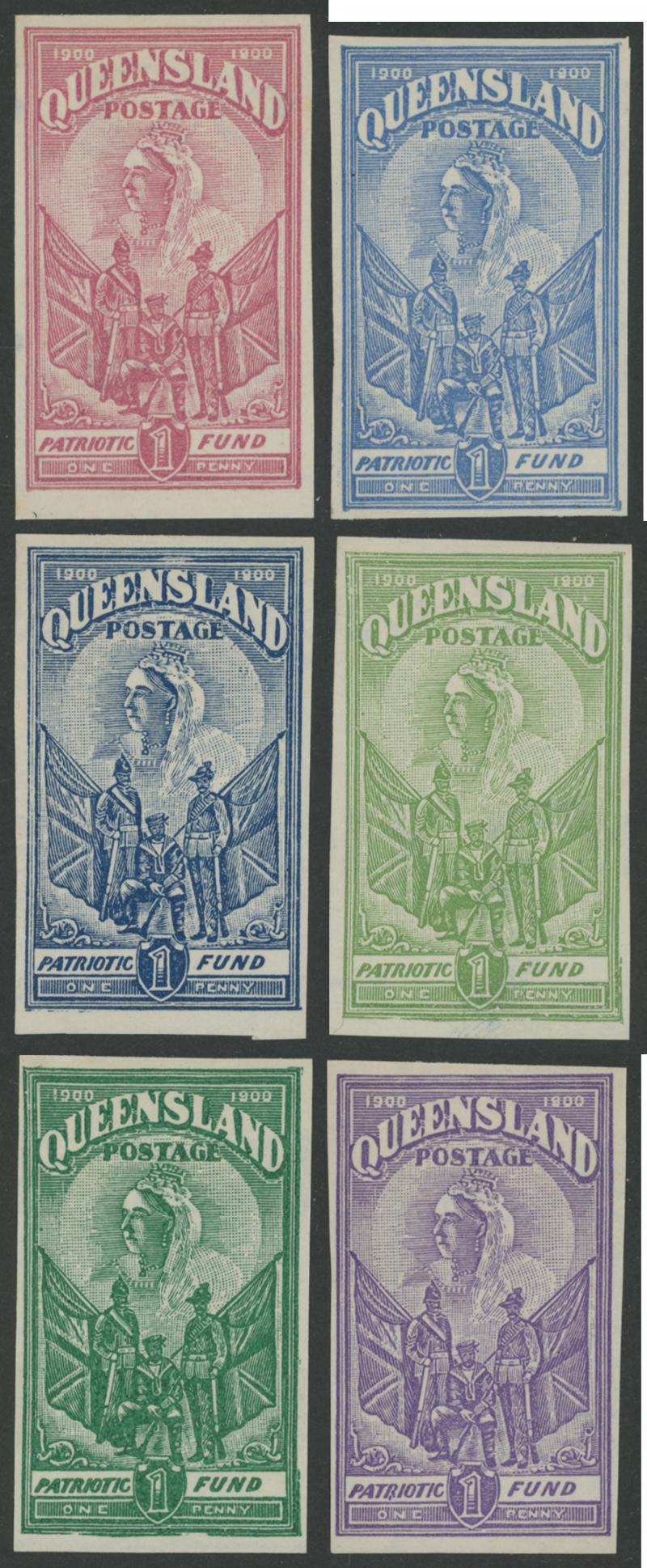 1900 Boer War Charity 1d imperforate colour trials on ungummed Crown/Q watermarked paper in carmine-rose, ultramarine, indigo,