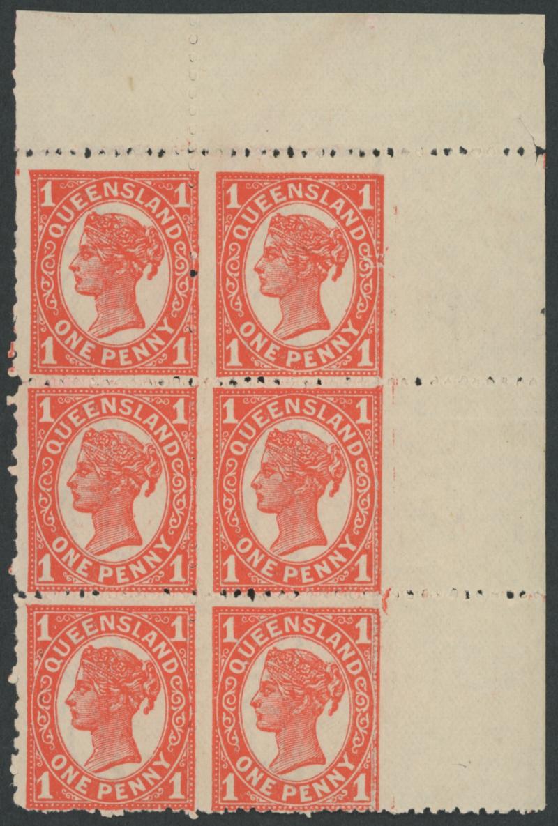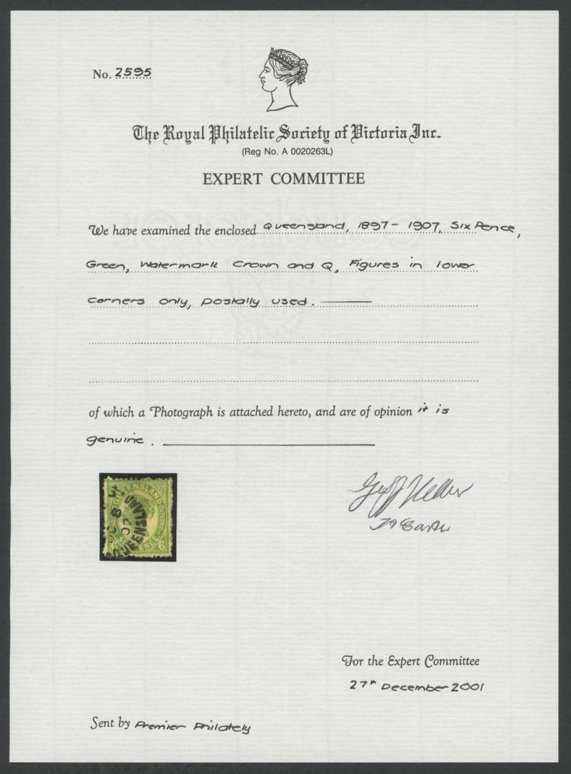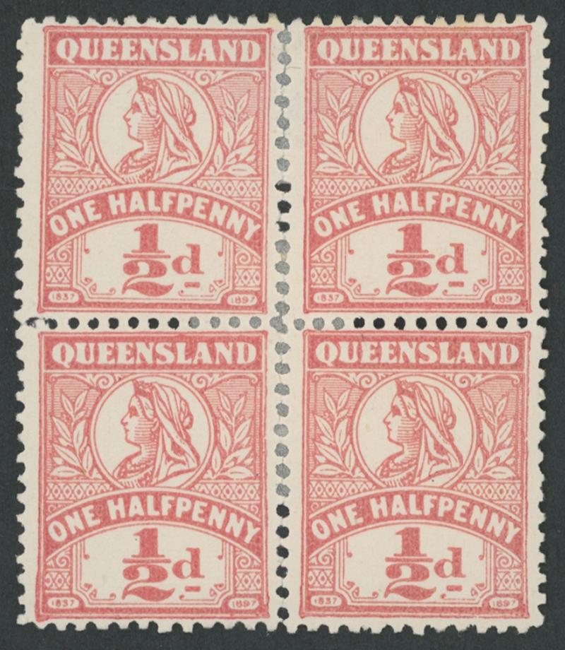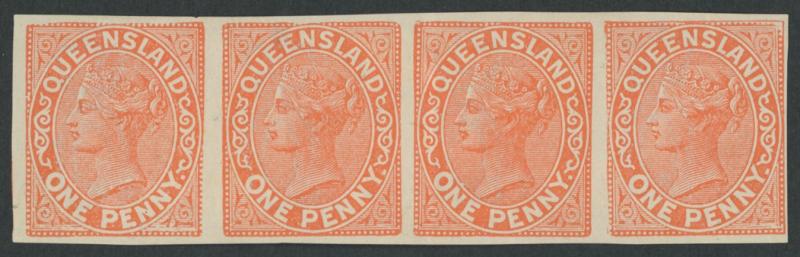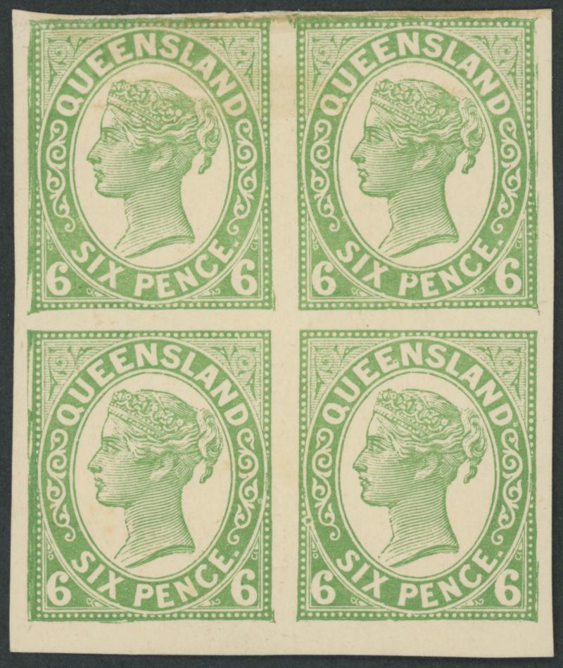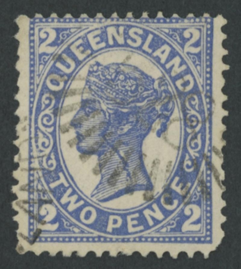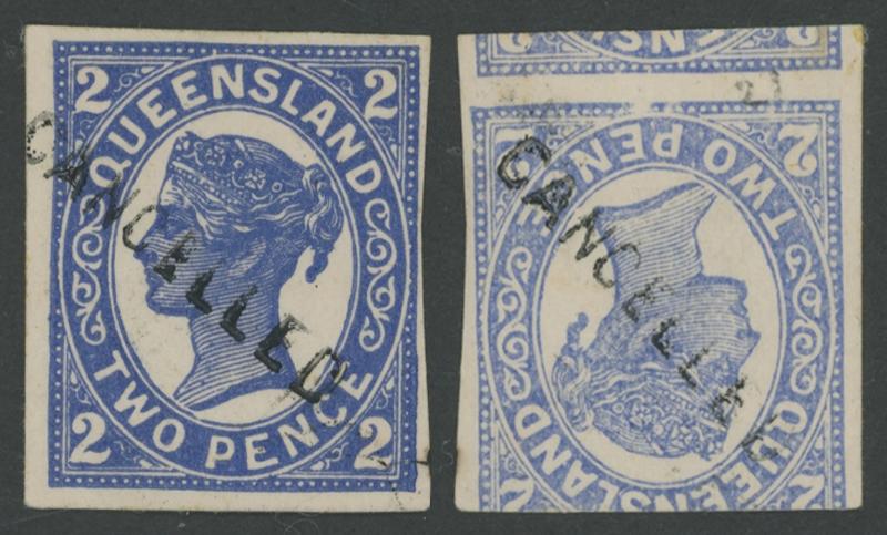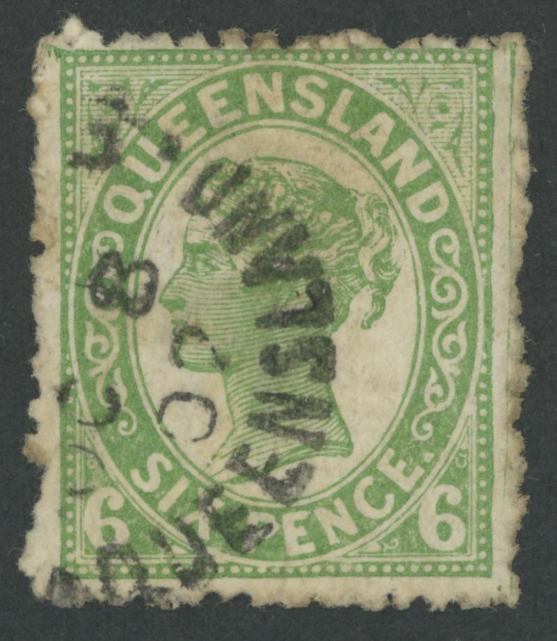 irregular perfs, partial '.../OC8/02/QUEENSLAND' cds, Cat $25,000 (£16,000). Ex Colonel Harrie Evans: sold in 2002 for $29,430 (Sale 96 Lot 417). One of the great rarities of Queensland, and of the Commonwealth Period States issues. This is the
