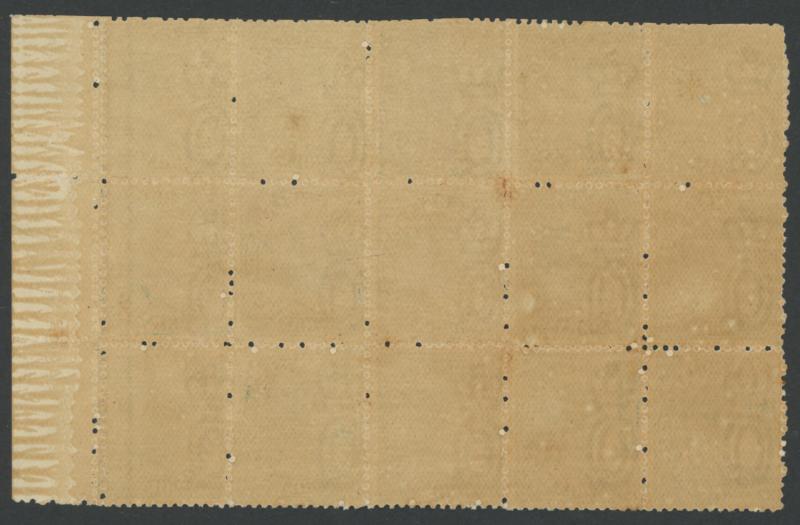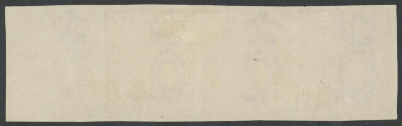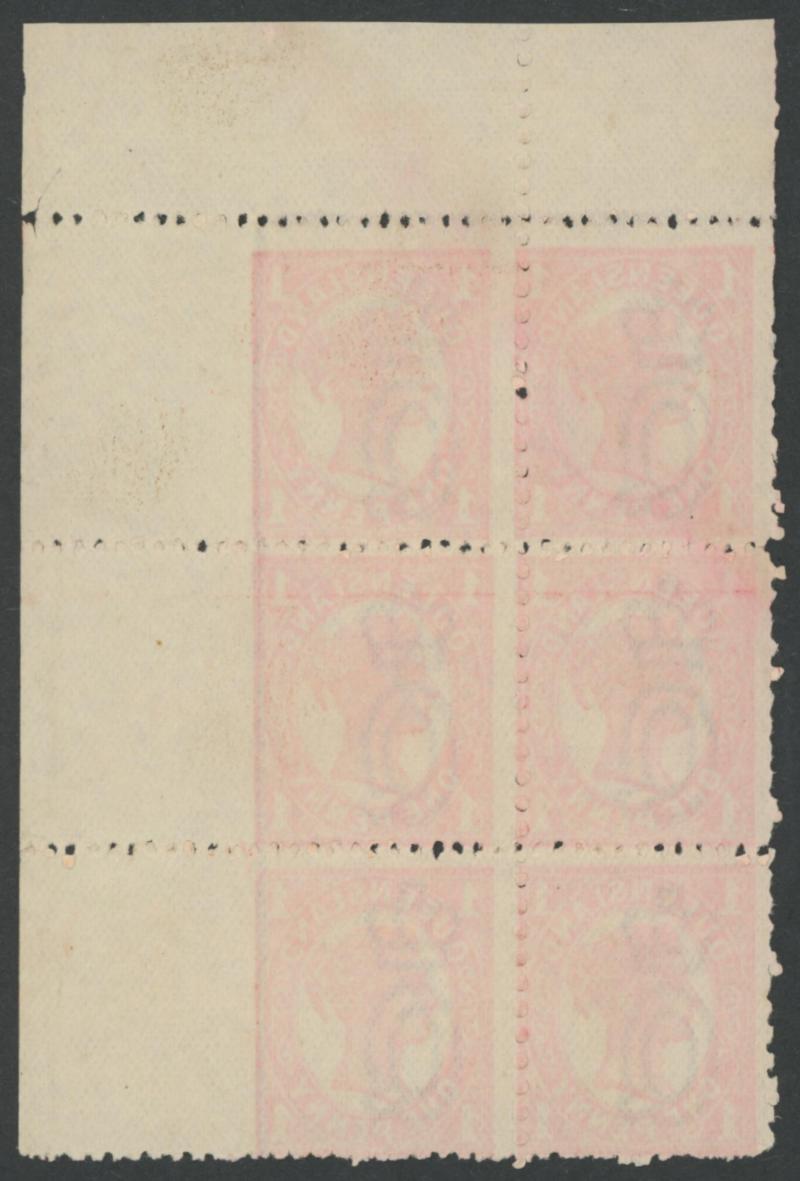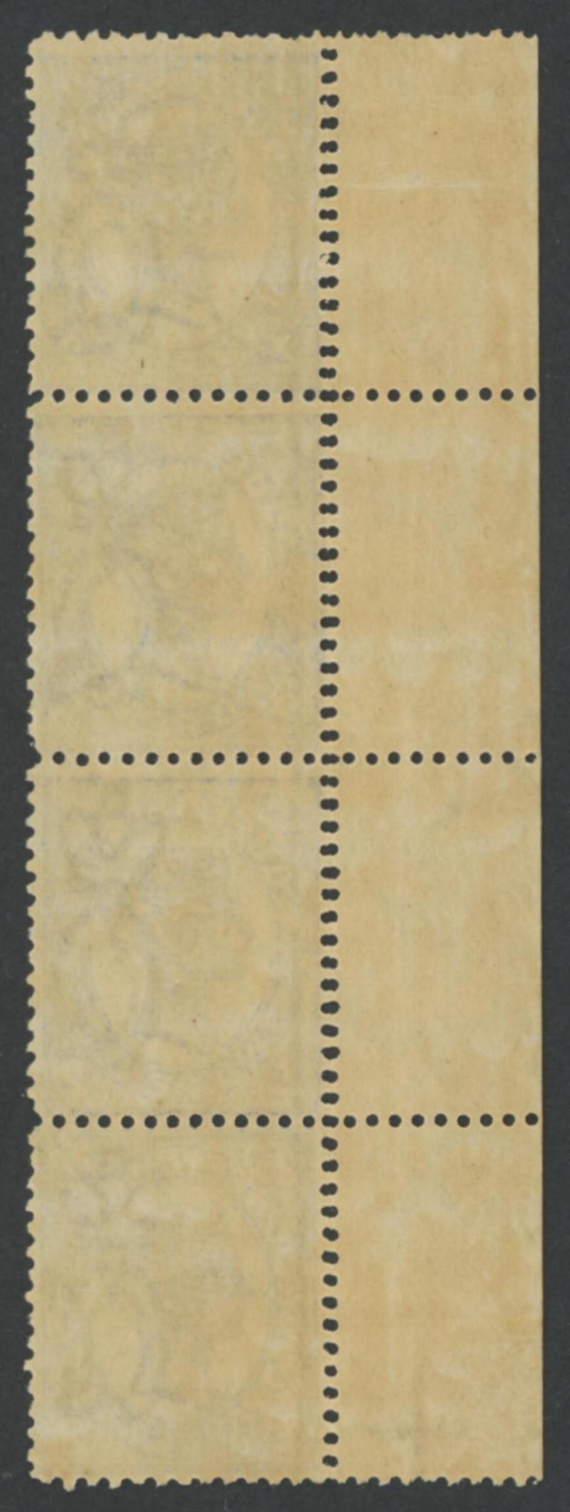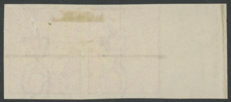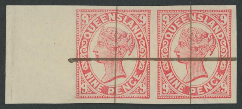 Crown/Q watermarked paper ACSC Q43(E)1A from the left of the sheet, defaced with ruled ink-lines in black, Cat $4000+ for singles. Unissued design. Ex William Knight, JH Chapman, Colonel Harrie Evans and Bernie Manning: sold for $4425 (Sale 146 Lot