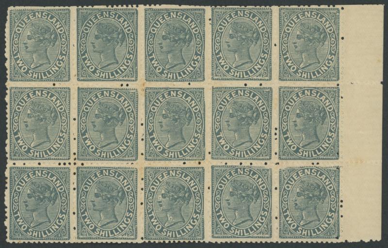 1887-89 QV Second Sidefaces (Lined Background) New Plates Crown/Q Watermark '6' 2/- perforated plate proof block of 15 (5x3) in