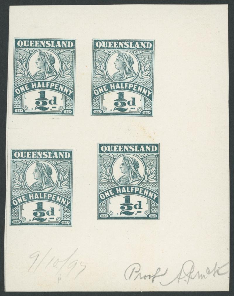 1897 QV Diamond Jubilee ½d perforated plate proof with '1837 - 1897' in the Lower Corners in black on ungummed unwatermarked wove