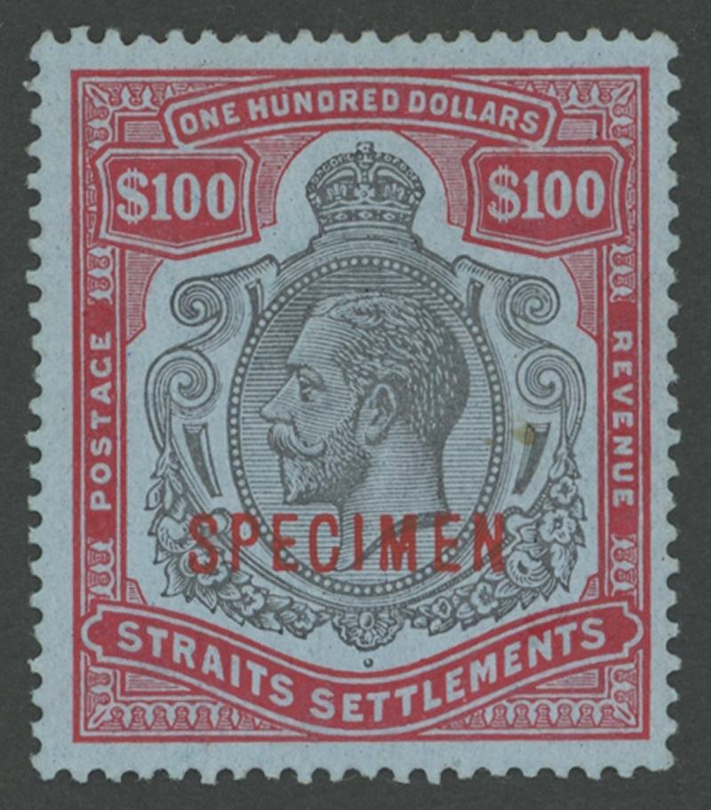 1912-23 KGV Scroll Design Keyplates Multiple Crown CA Watermark $100 black & carmine/blue 'SPECIMEN' overprint SG 214s, unusually