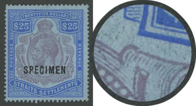 1921-33 KGV Scroll Design Keyplates Multiple Script CA Watermark $25 purple & blue/blue 'SPECIMEN' overprint SG 240bs with Nick in