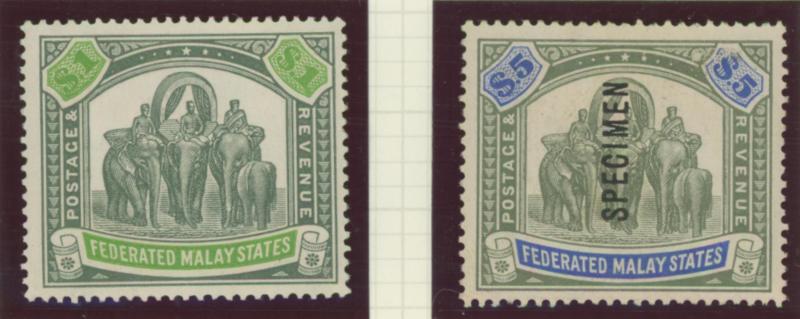 horseshoe 'SPECIMEN' puncture & Elephants $5 'SPECIMEN' overprint, Tiger $2 used and Elephants $2 strip of 4 (one unit thinned) with 'STAMP OFFICE/TAIPING' oval datestamp, etc, lightly duplicated in places, condition a little variable with some gum