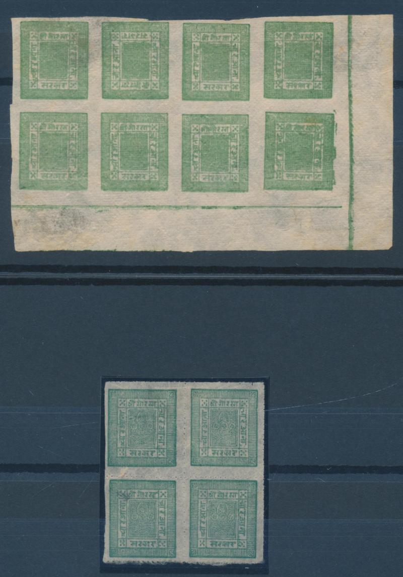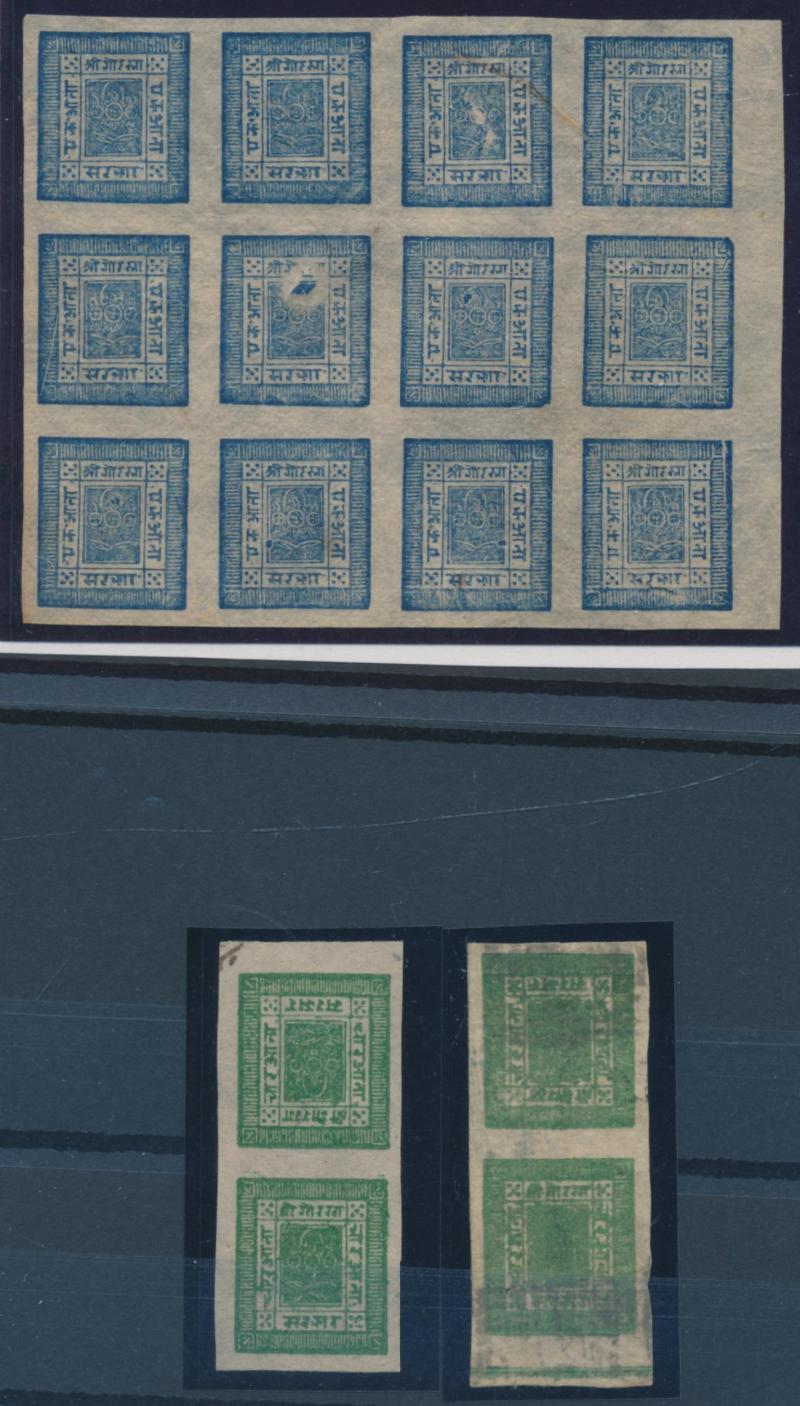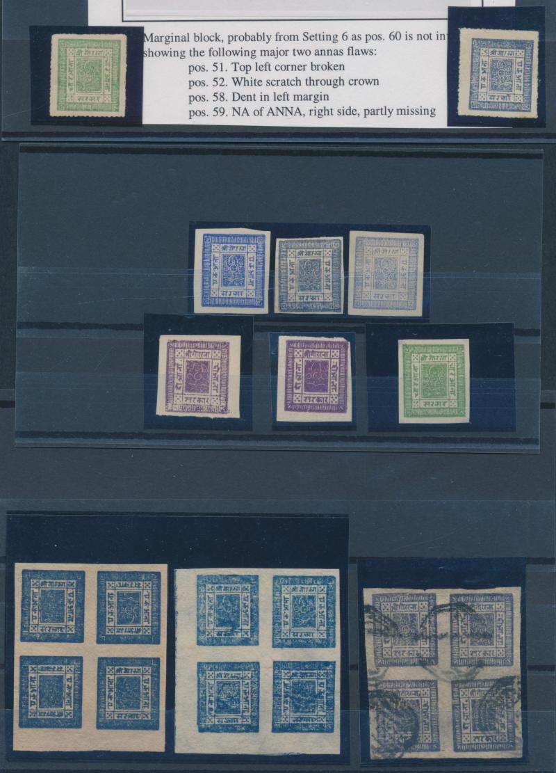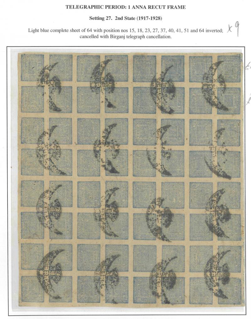 very fine, various crescent-cancels including full strikes of Birganj & Kathmandu and fancy-boxed cancel of Amlekhganj, then ½a black Stg 13 complete sheet of 64 (8x8) with six horizontal or vertical Tete-Beche Pairs SG 34a, 1a dull ultramarine Stg